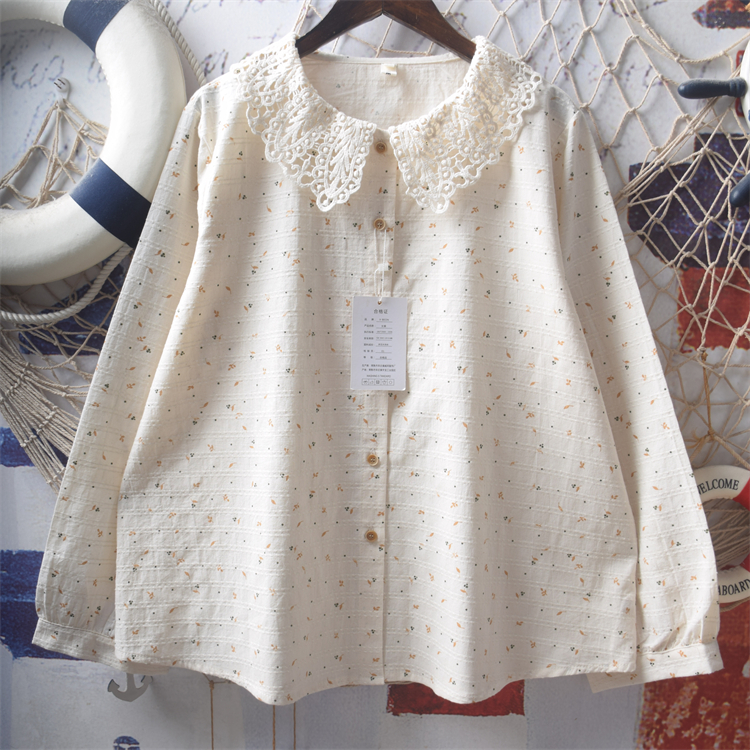 日系软妹森女田园风镂空蕾丝娃娃领宽松纯棉长袖碎花衬衫复古上衣