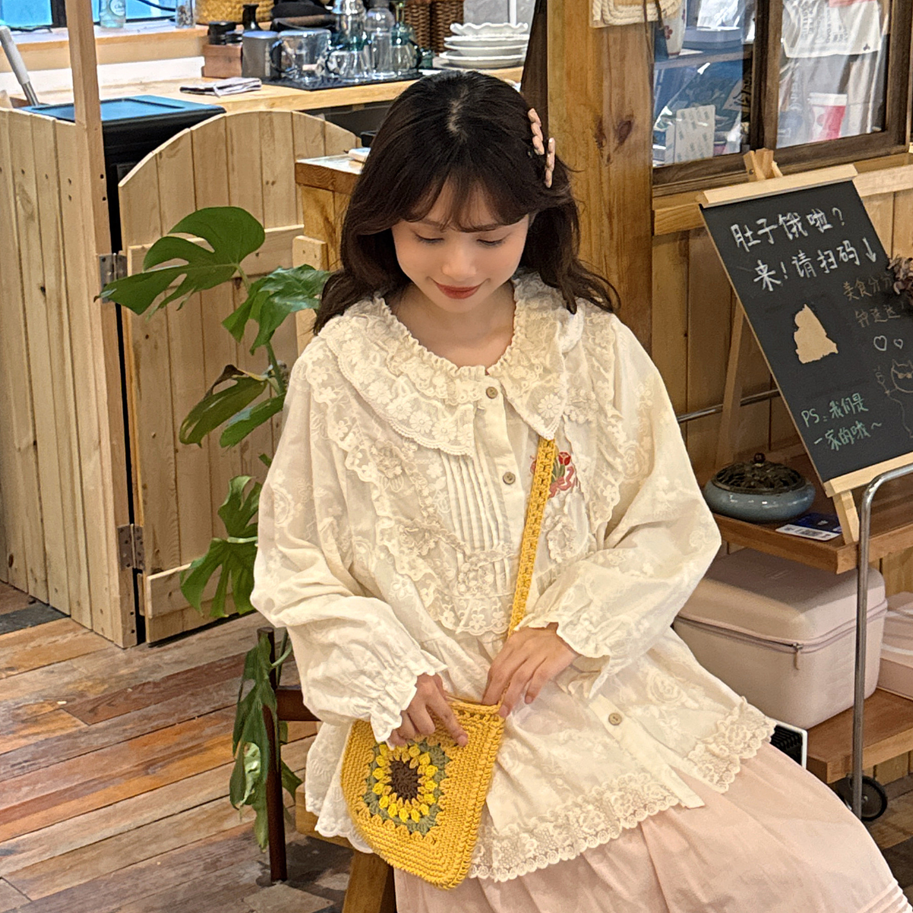 森系温柔蕾丝娃娃领长袖衬衫精致花朵刺绣内搭叠穿打底衫甜美上衣