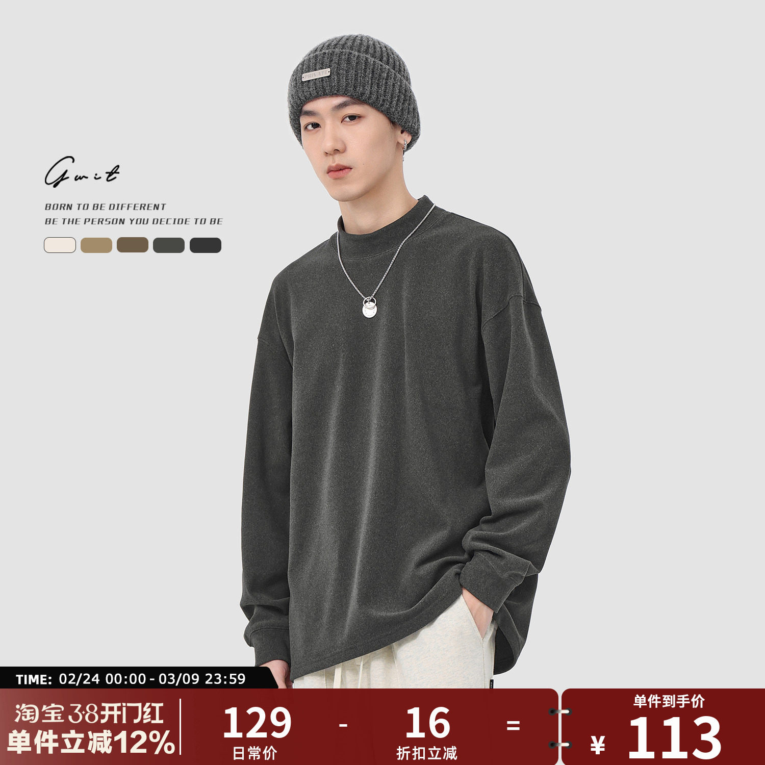 GWIT 美式重磅德绒打底衫秋冬保暖秋衣半高领长袖T恤纯色内搭男