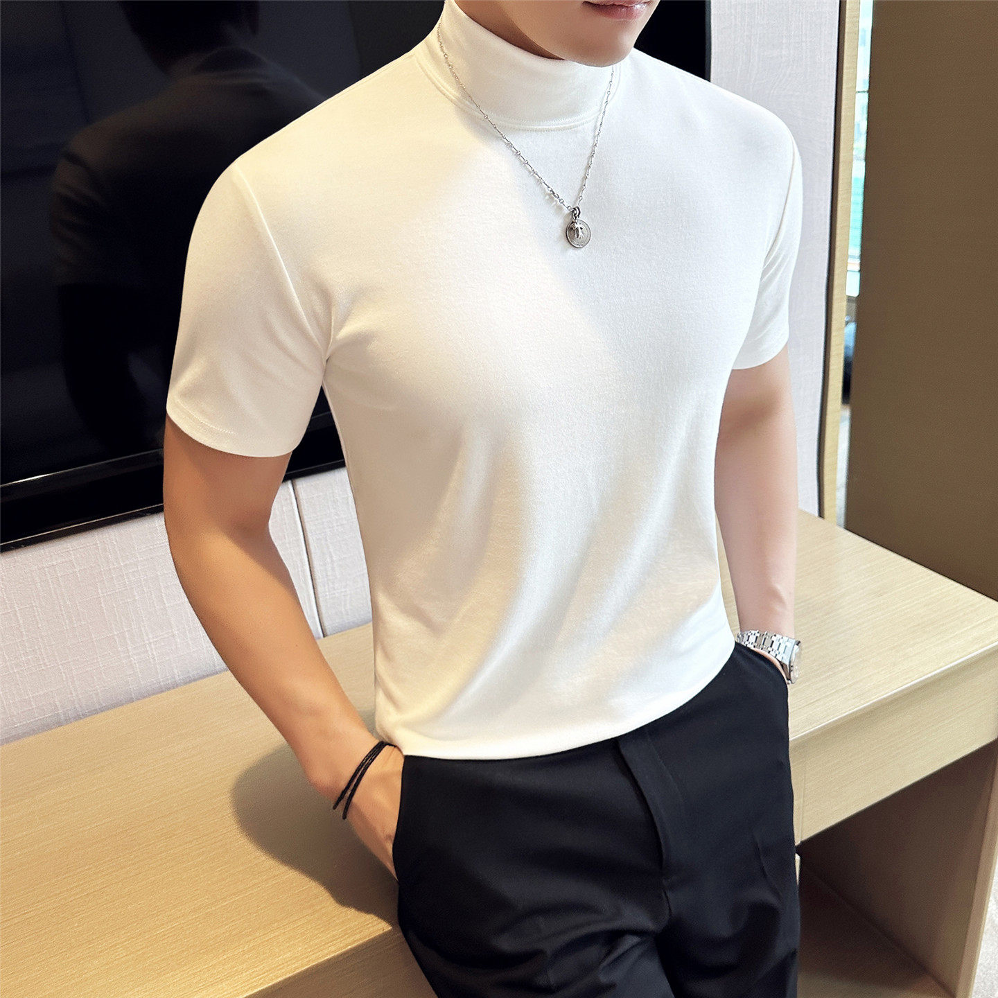 高级感半高领短袖打底衫白色男士弹力小高领长袖T恤内搭中领弹力