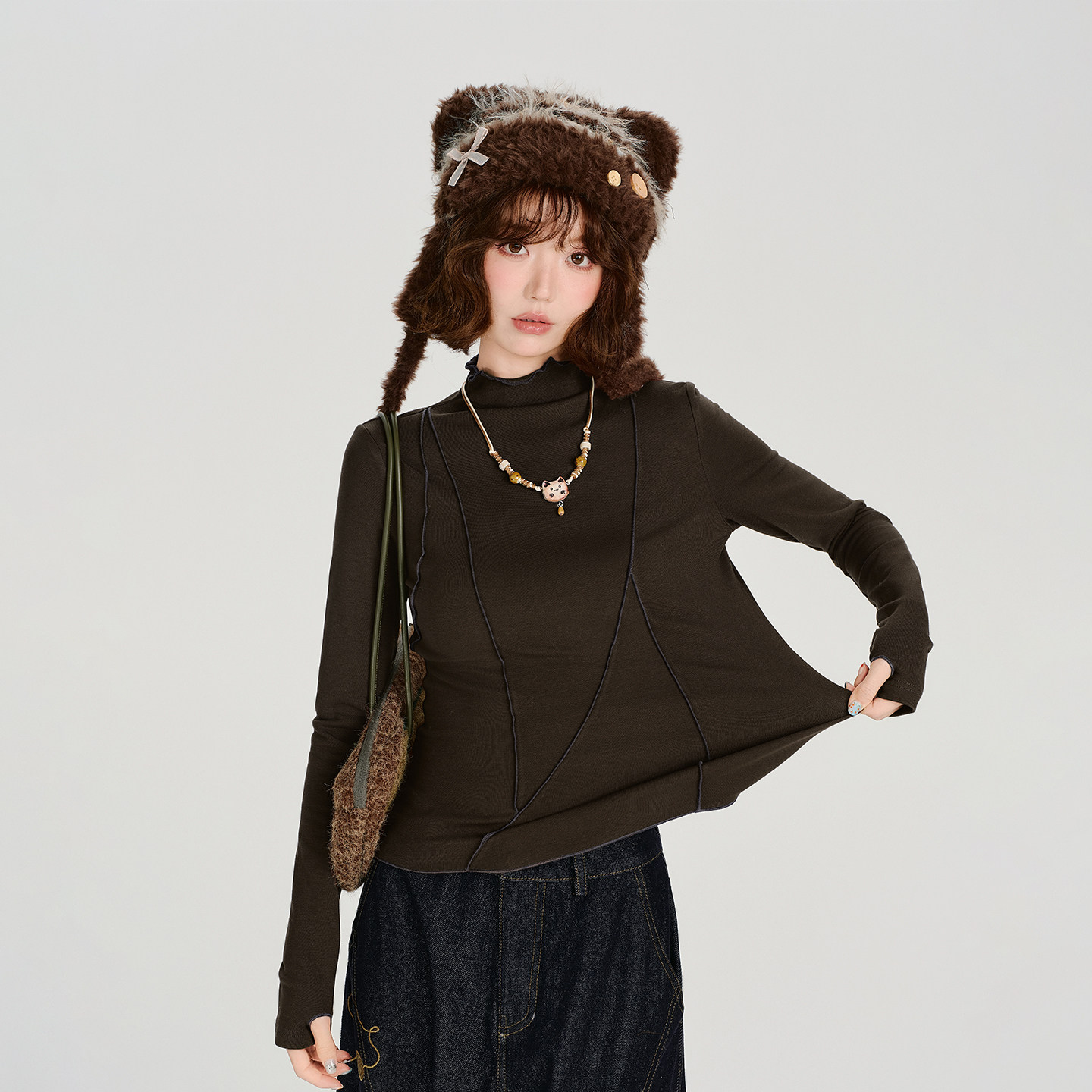 Girlyhalo美式复古分割设计感小高领长袖t恤女秋冬打底内搭上衣