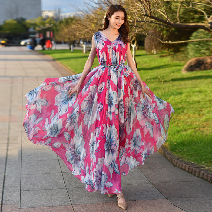 2023新款春夏季三亚度假连衣裙海边大码沙滩裙女雪纺碎花吊带长裙