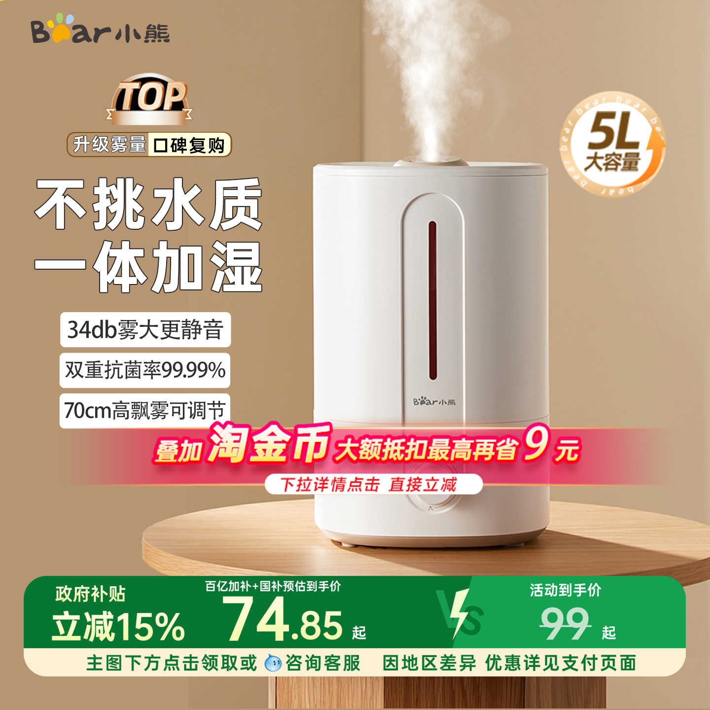 小熊加湿器5L大容量办公室孕妇婴儿卧室空调房旋钮控制带滤芯正品