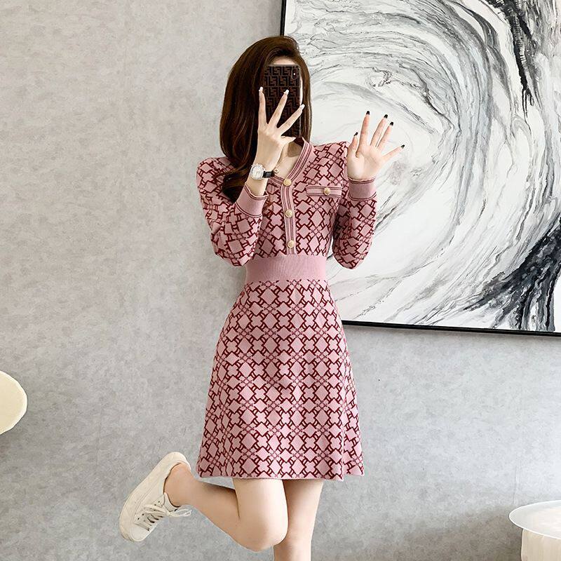 秋冬女装韩版批新款发V领chic毛衣A字短裙灯笼长袖收腰针织连衣裙