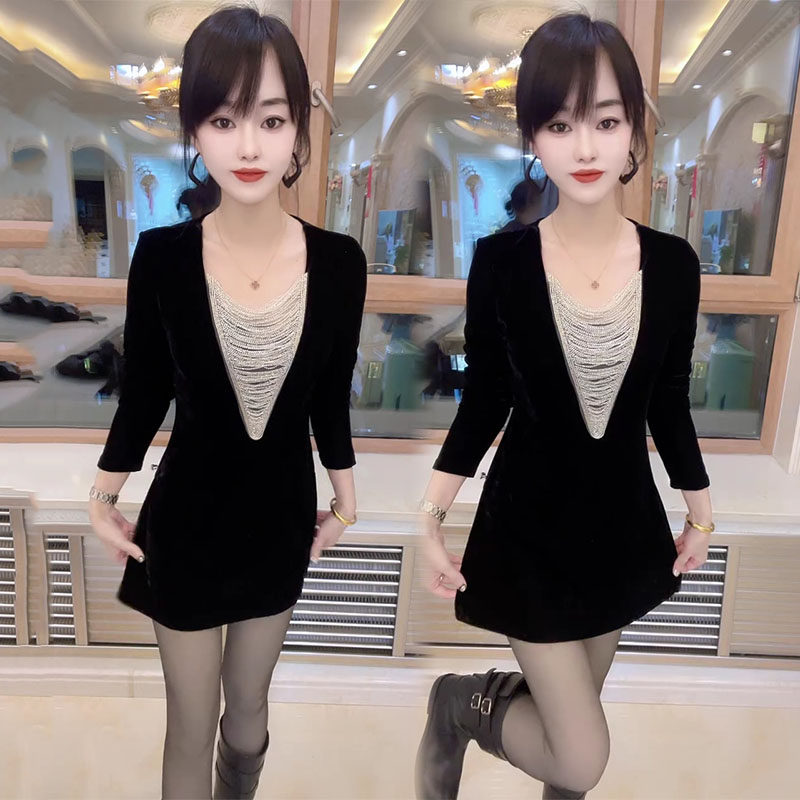 韩版时尚V领钻长袖连衣裙女2025秋冬新款名媛丝绒显瘦开叉裙打底
