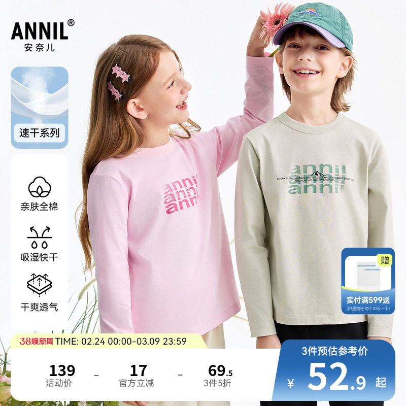 【全棉速干T】安奈儿童装男童女童圆领长袖T恤2026春新款运动休闲