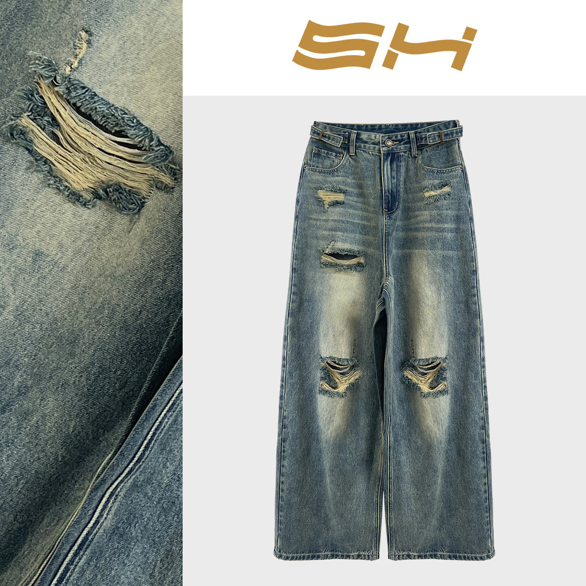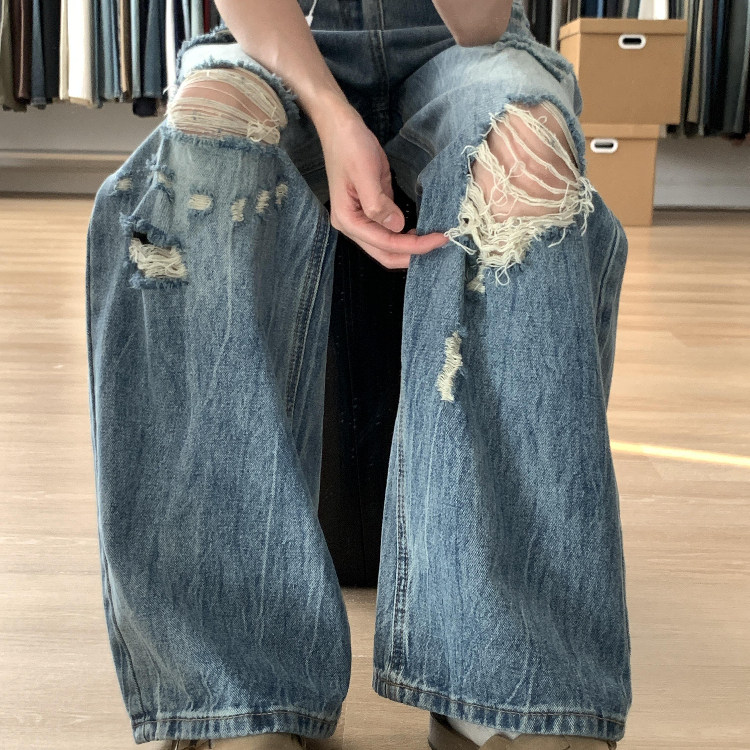 美式潮流街头辣妹乞丐破洞牛仔裤子vibe高街复古宽松显瘦阔腿裤女