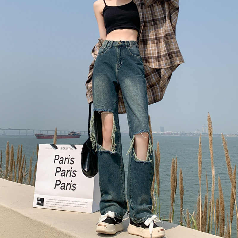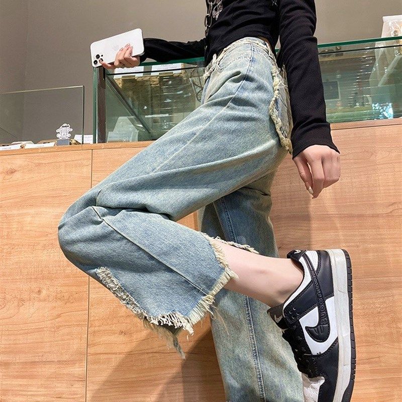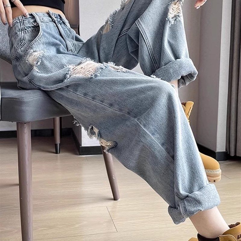 高街复古乞丐破洞直筒牛仔裤女夏季2023新款高腰显瘦宽松阔腿裤子