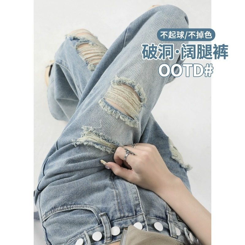 高街复古乞丐破洞牛仔裤女夏季薄款水洗做旧高腰垂感宽松阔腿裤子