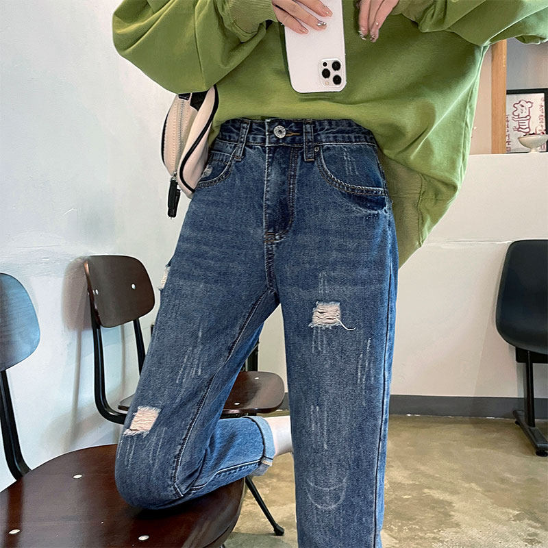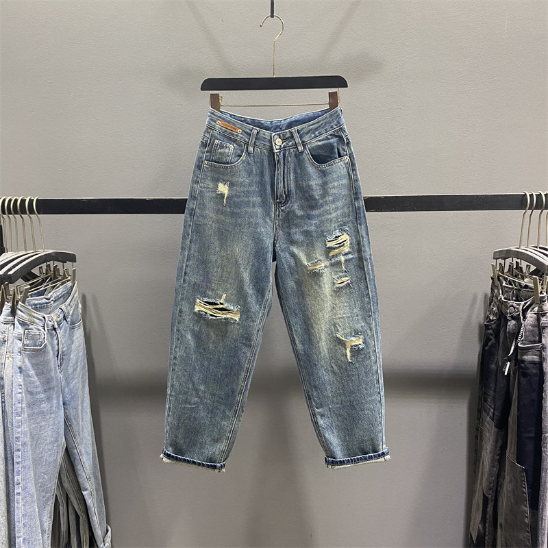 破洞哈伦牛仔裤女秋2025新款高腰宽松显瘦小个子乞丐萝卜老爹裤子