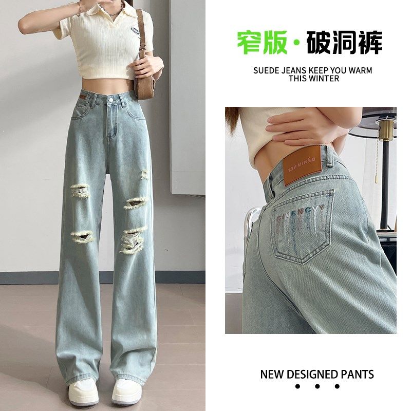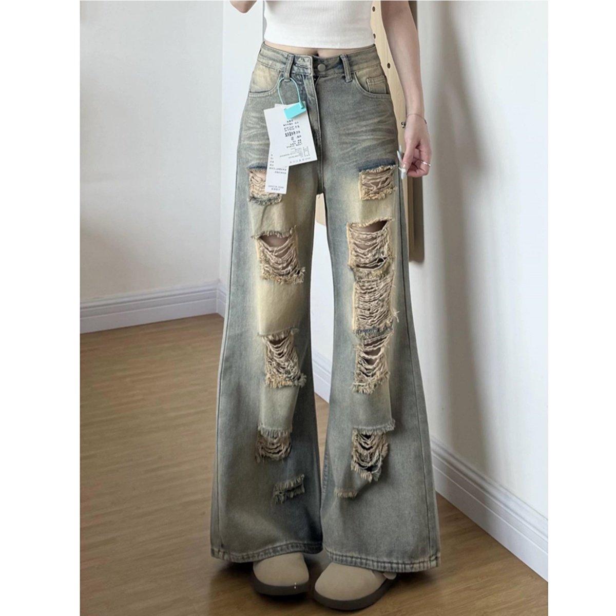 怀旧破洞牛仔裤女辣妹直筒乞丐秋季薄款宽松垂感高腰阔腿拖地裤潮