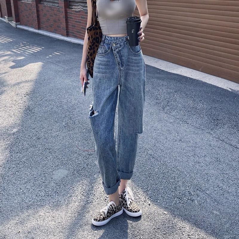 高街设计感破洞牛仔裤女小个子百搭高腰宽松显瘦直筒阔腿乞丐裤子