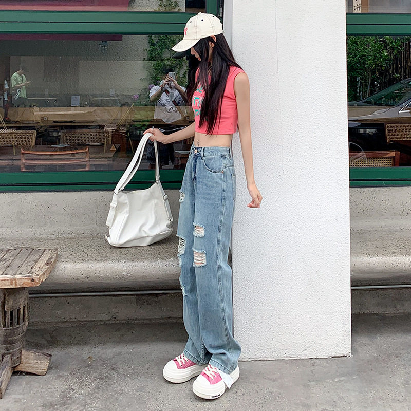乞丐破洞牛仔裤女夏季薄款显瘦直筒宽松辣妹美式复古高街拖地裤子
