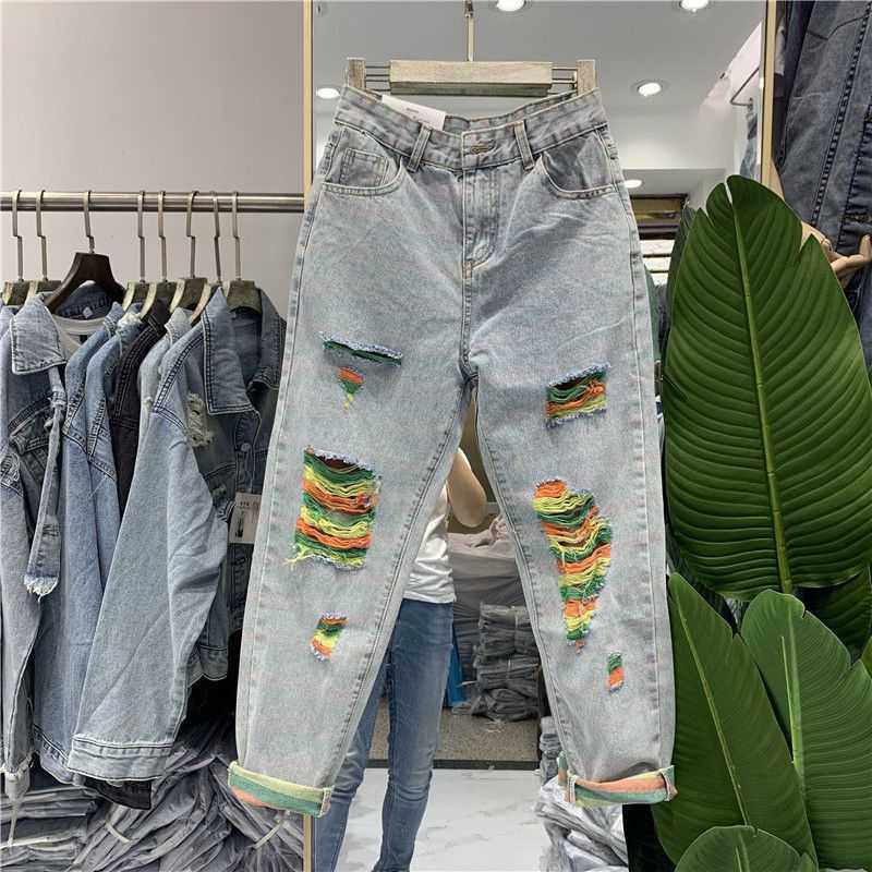 彩色破洞彩虹乞丐牛仔裤女2025春夏新款高腰宽松直筒哈伦九分裤潮
