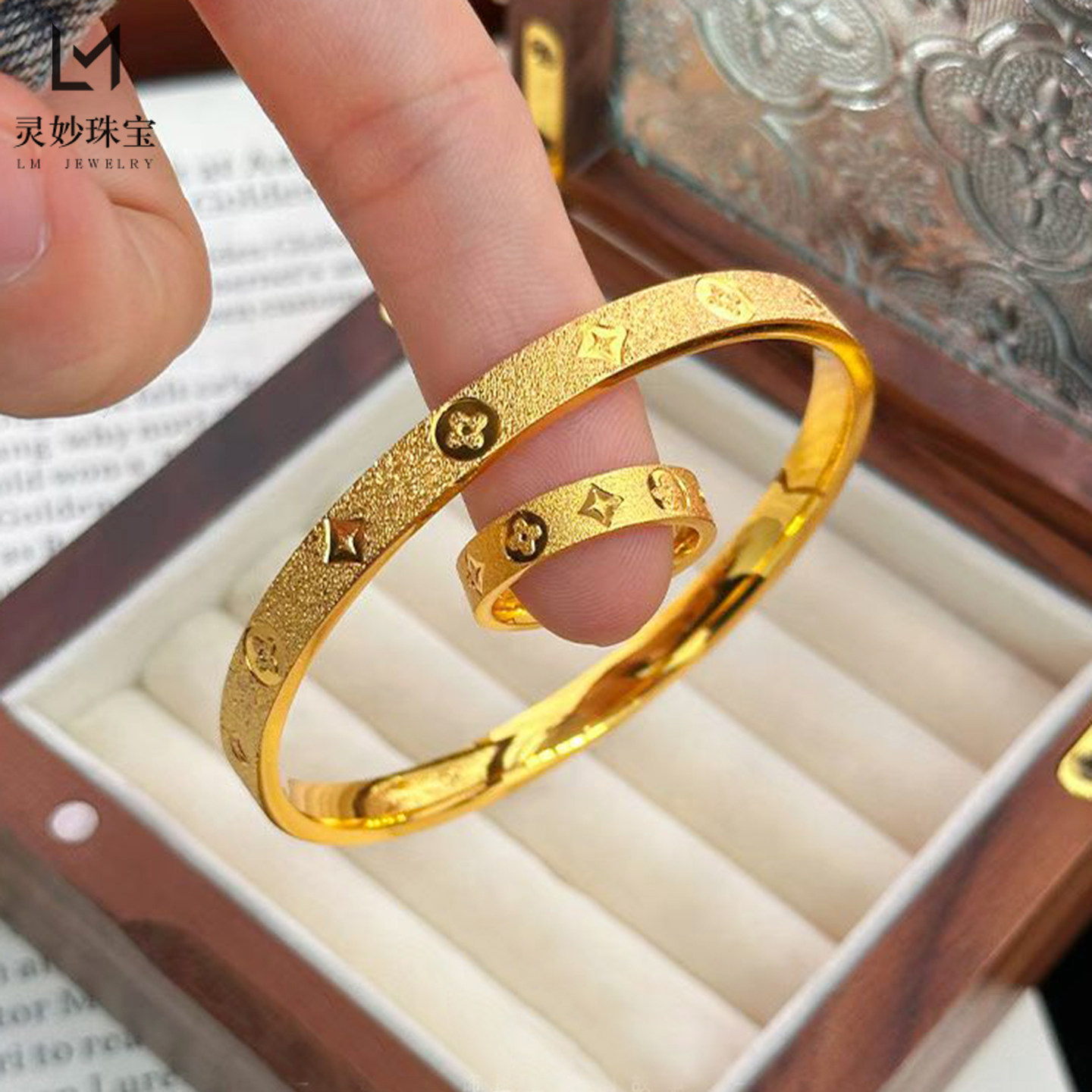 新中式古法沙金满天星四叶草手镯实心素圈镯子戒指老钱风送女友礼
