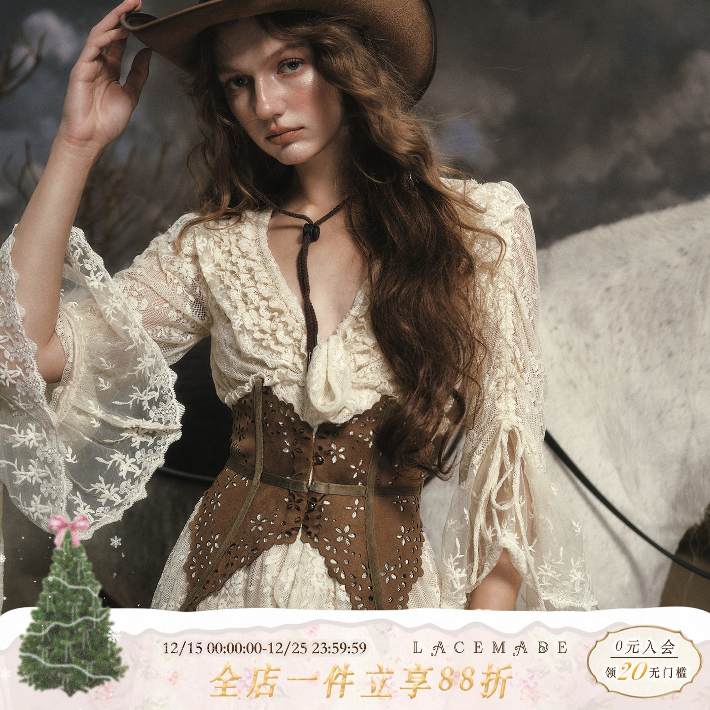 LaceMade 白马公主 法式复古重工蕾丝v领连衣裙麂皮鱼骨腰封套装