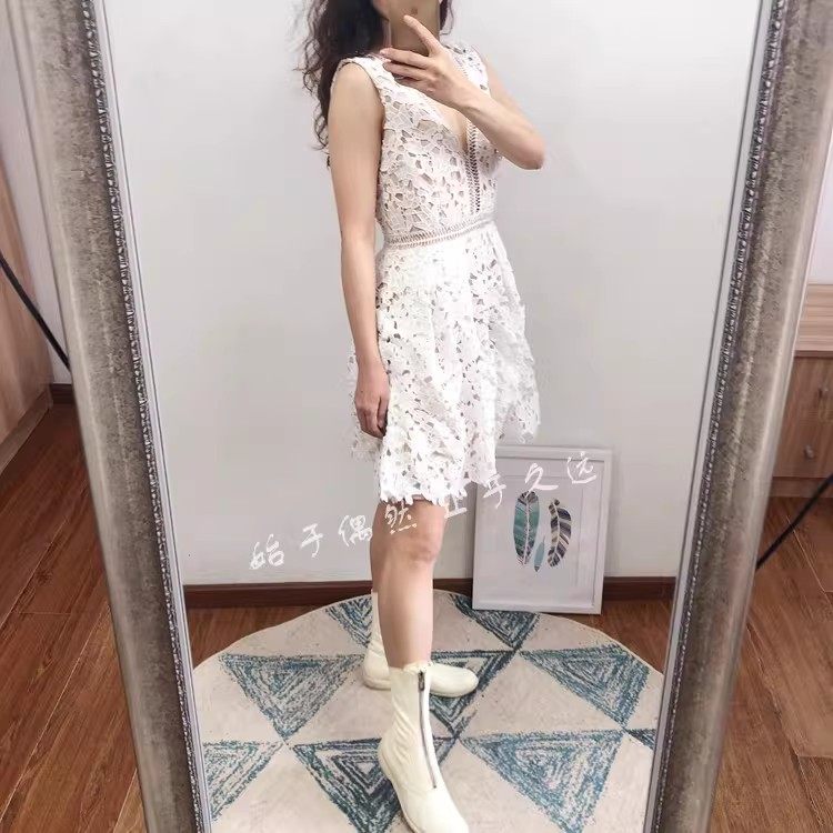 青春活力悦动 优雅文艺 镂空蕾丝连衣裙白色V领小礼服短裙女新款
