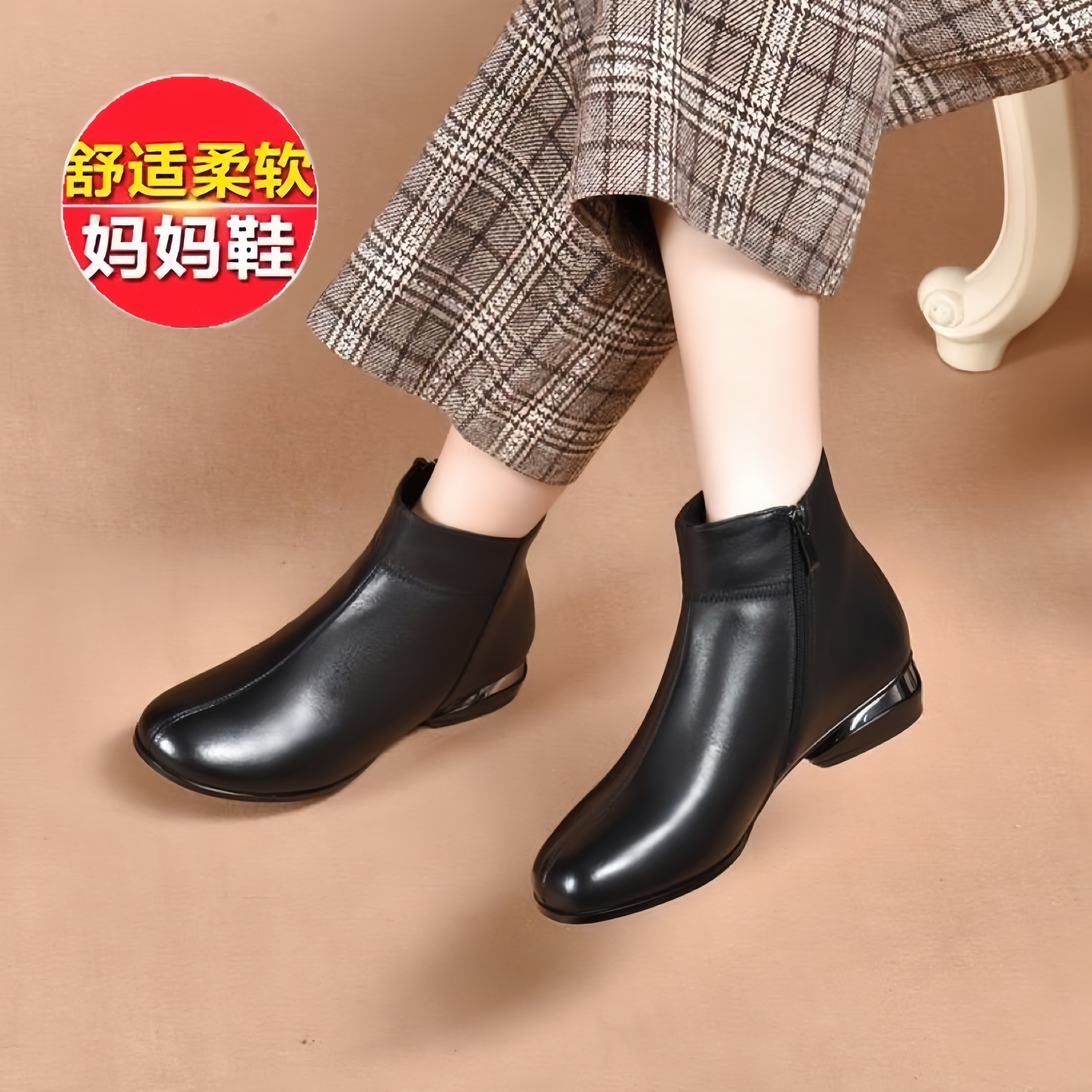 秋冬季软皮软底真皮短靴大码女鞋舒适妈妈鞋二棉鞋女加绒平底靴子