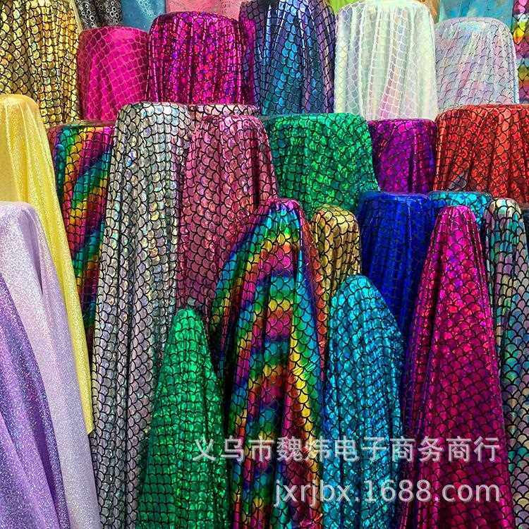 新款直销鱼鳞烫金布舞台演出美人鱼服装面料四面弹力镭射幻彩布料