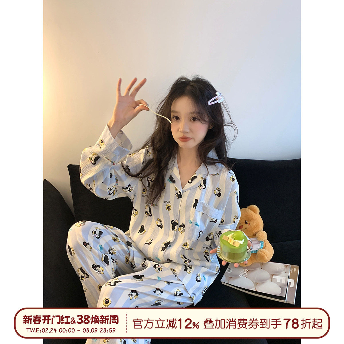 三福女春季翻领排扣睡衣套装 趣味动物宽松长袖家居服514833