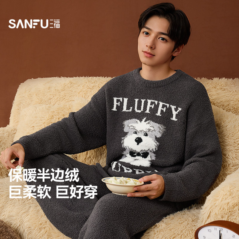 三福男冬季半边绒卡通动物睡衣套装 趣味宽松保暖家居服507920
