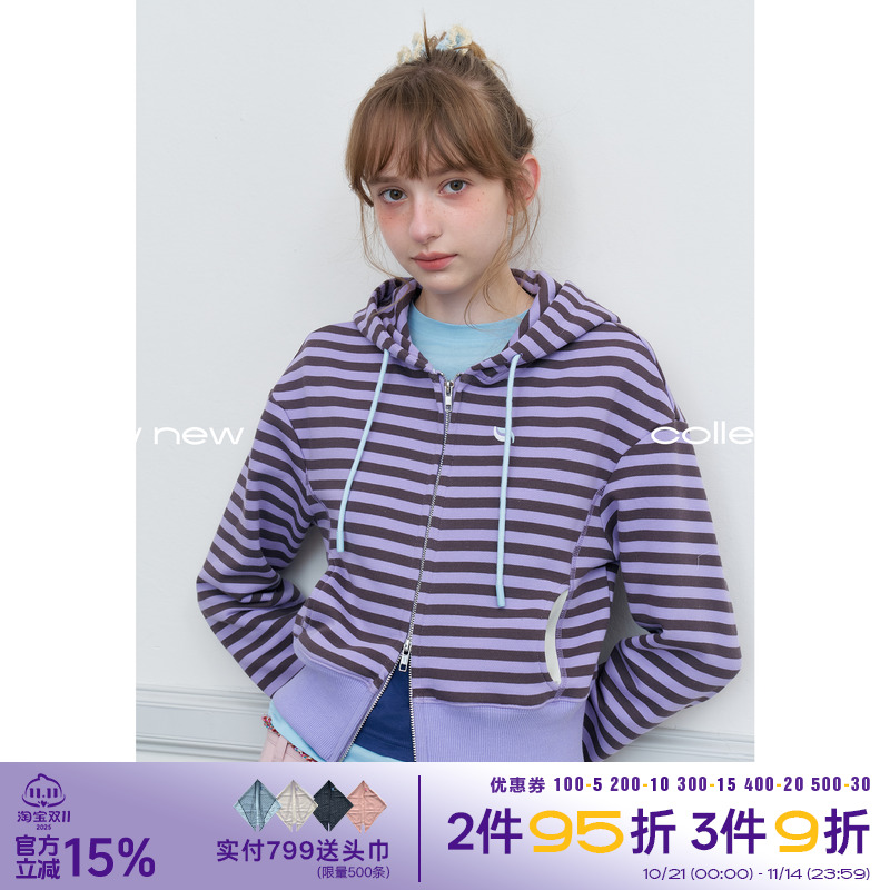 riverstone plus 撞色条纹短款连帽卫衣女秋季百搭开衫拉链外套