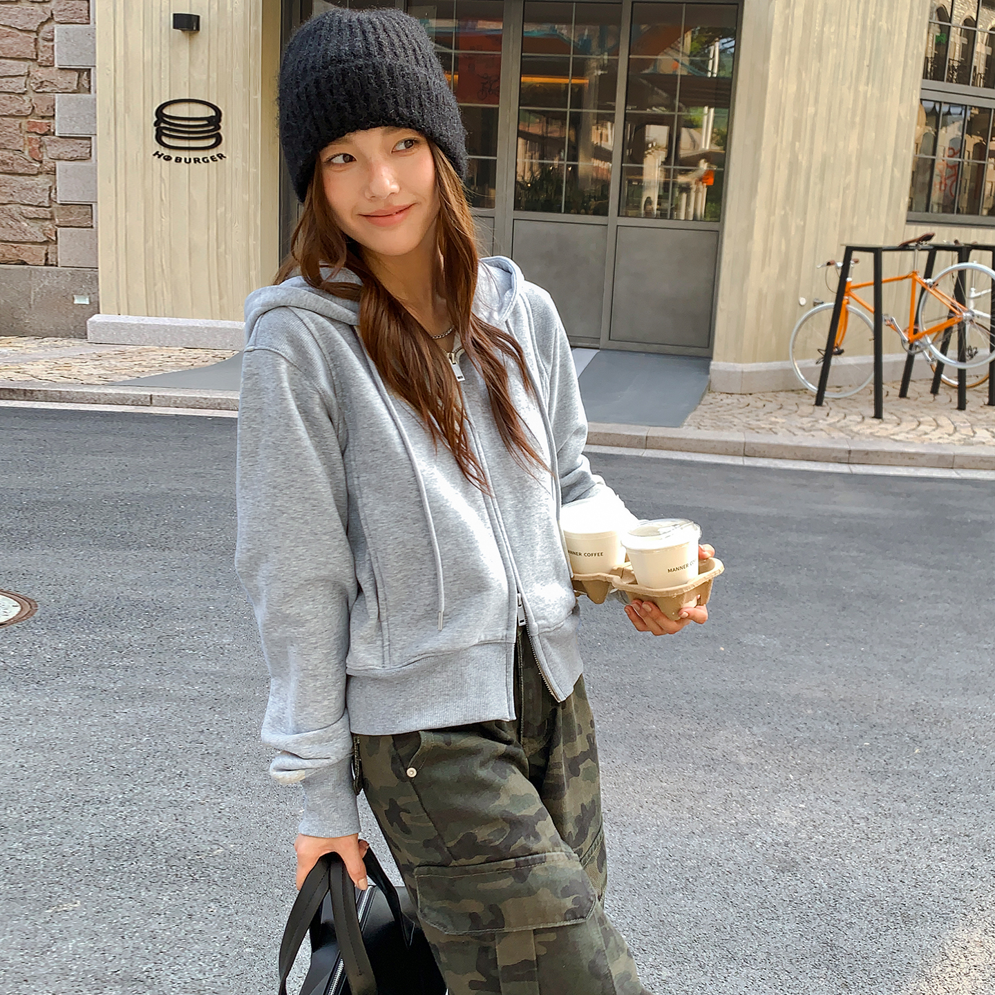 橘子树在哪儿灰色短款连帽卫衣外套女秋季款宽松慵懒风双拉链开衫