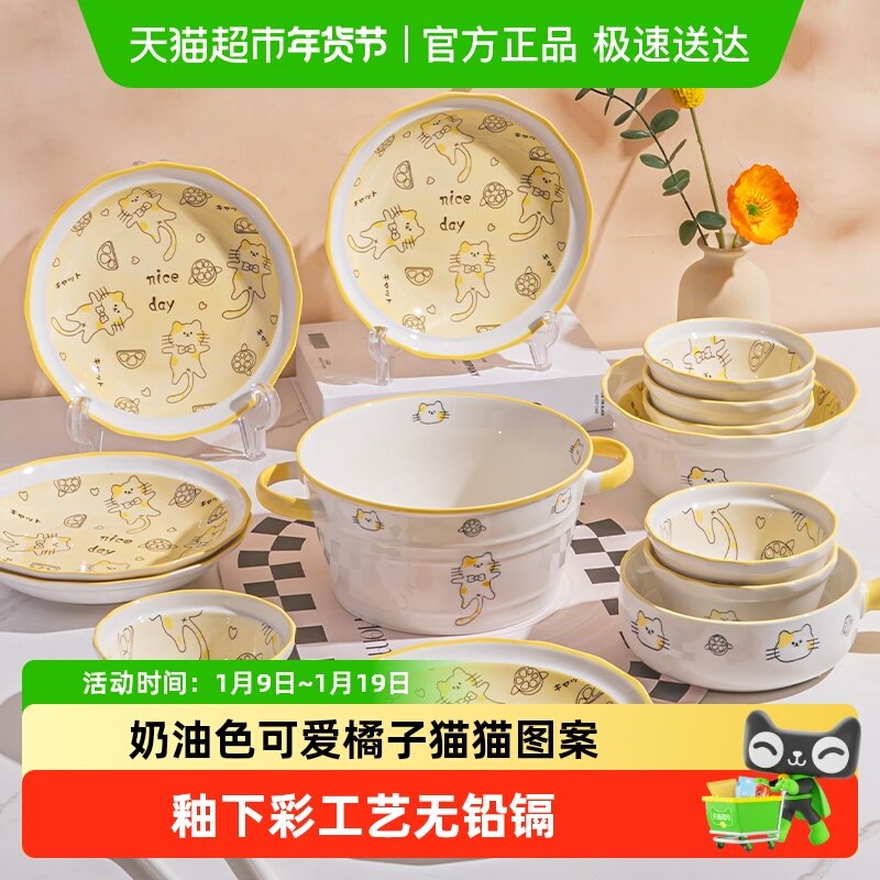 可爱卡通碗碟套装家用陶瓷碗筷盘乔迁送礼新婚釉下彩奶油风餐具无