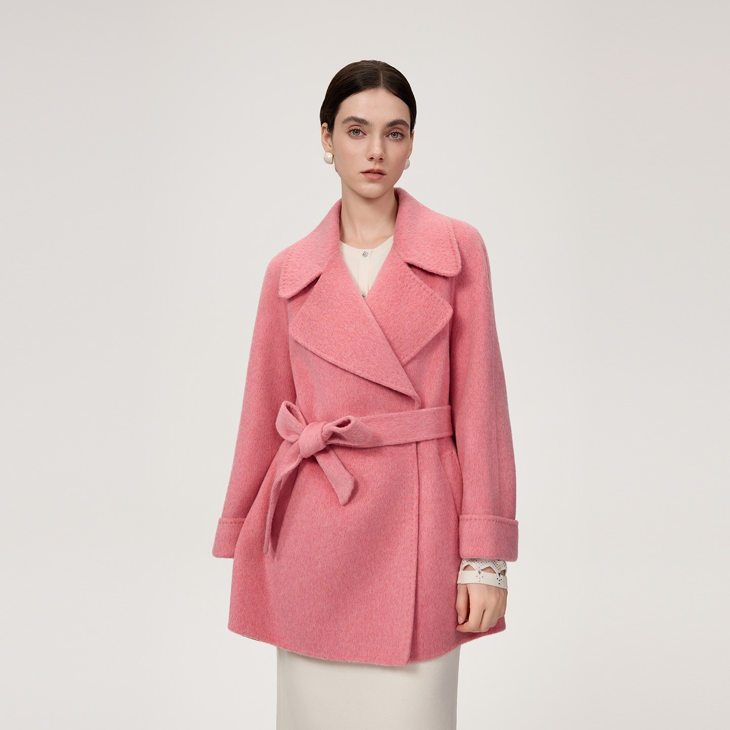 冬季新款重磅驼绒轻盈保暖简约系带大翻领羊毛双面毛呢大衣外套女
