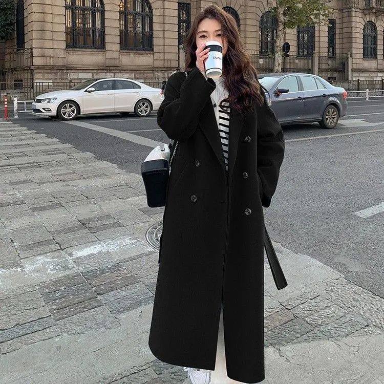 黑色毛呢外套女夹棉加厚秋冬季韩版加棉高个子加长款正肩呢子大衣