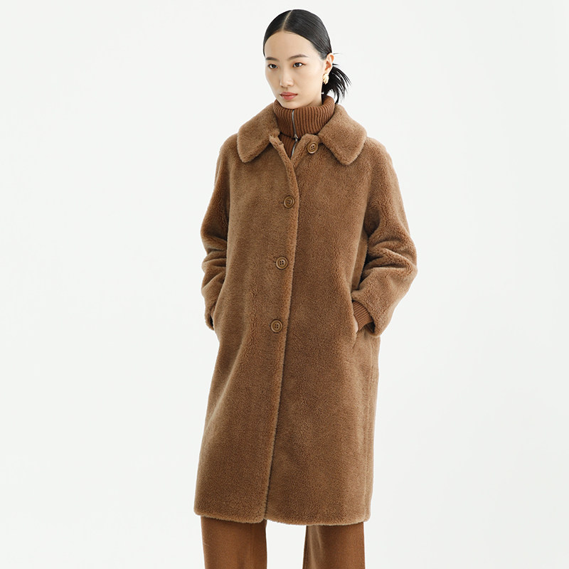 HM女装毛呢外套冬季保暖仿皮草中长款绒感大衣毛毛外套1101014