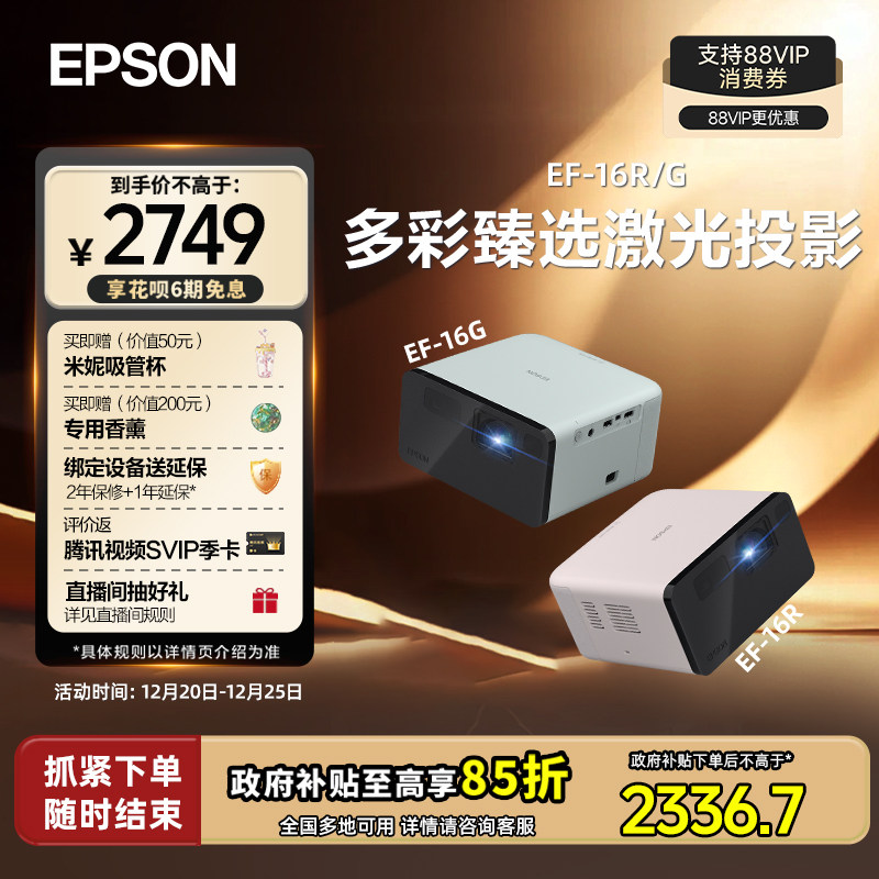 【政府补贴 立减15%】爱普生EPSON EF-16G/16R全彩3LCD智能激光投影机家用超高清卧室客厅庭影院游戏便携式