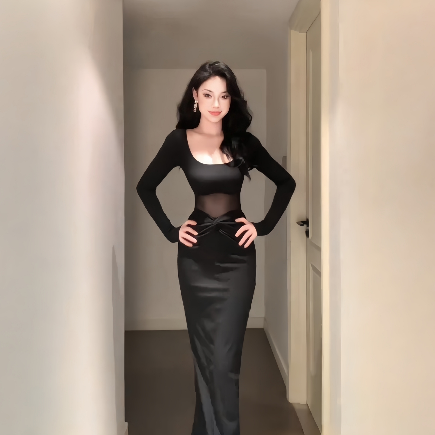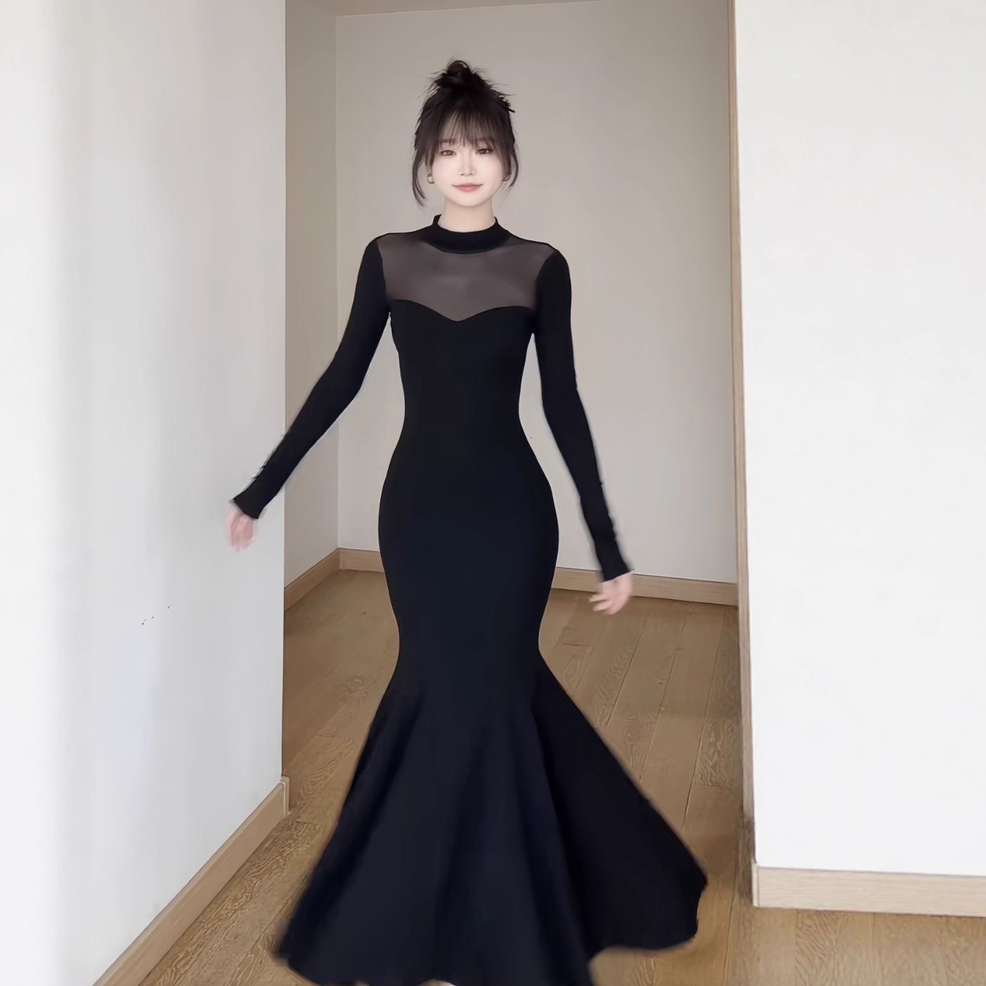 秋冬内搭黑色网纱连衣裙女纯欲风性感长袖包臀鱼尾裙2025新款长裙