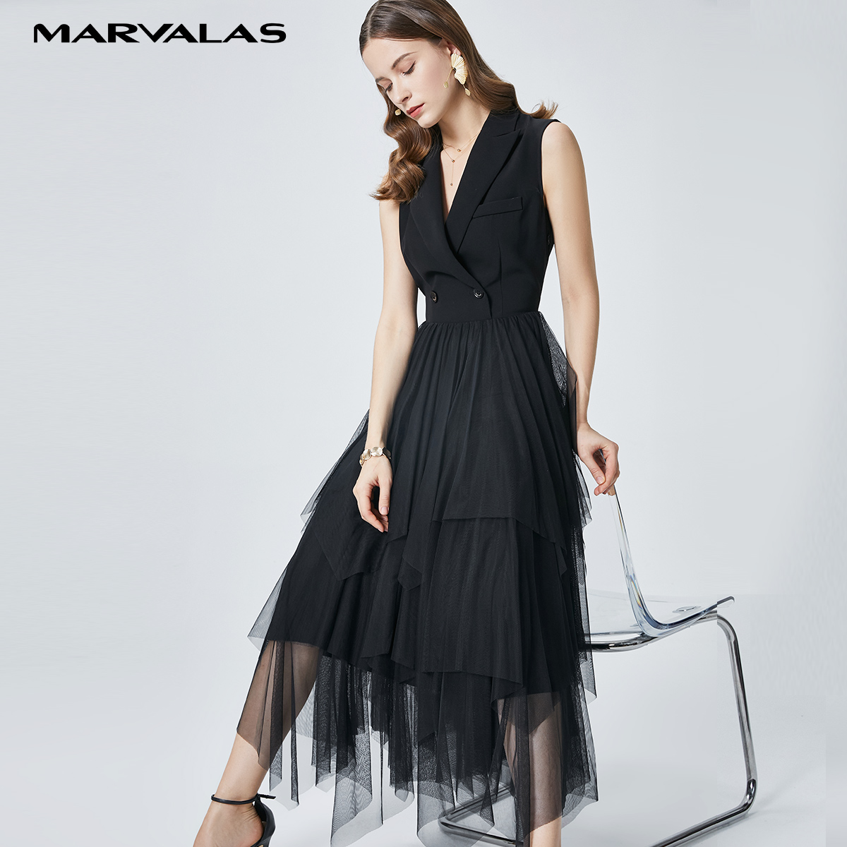 曼德诗黑色西装连衣裙女2025年夏款拼接网纱裙不规则气质蓬蓬裙