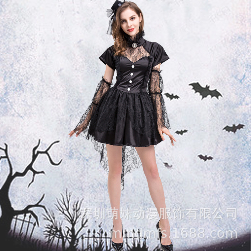 万圣节新款女巫服装黑色网纱连衣裙袖子蕾丝小魔女表演服角色扮演