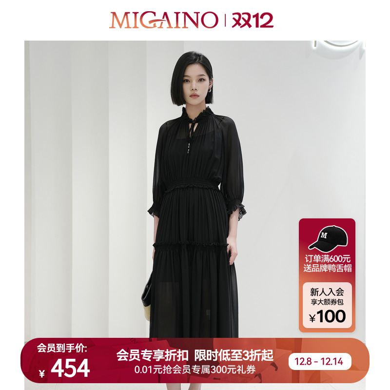 Migaino曼娅奴女装秋季新款优雅气质收腰显瘦裙子黑色网纱连衣裙