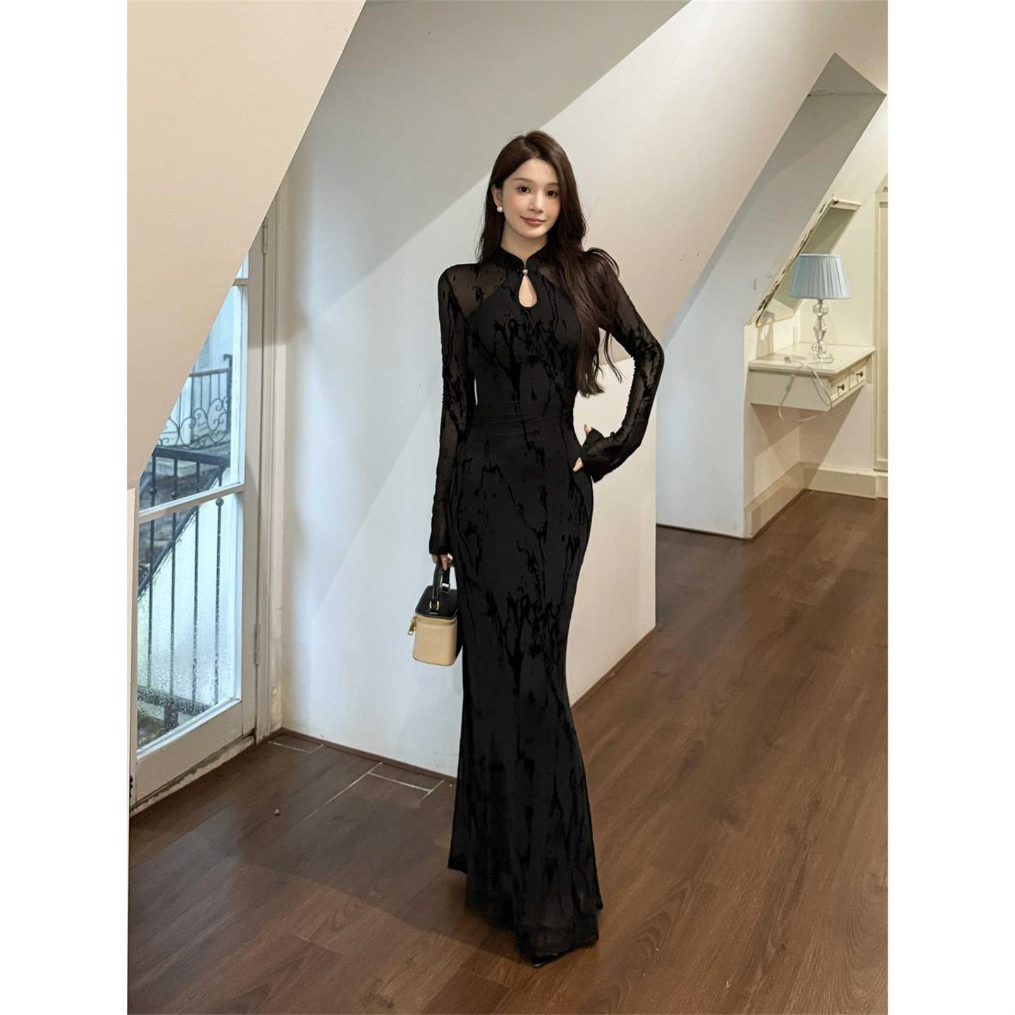 新中式改良旗袍黑色网纱连衣裙女2025秋季新款性感修身包臀长裙