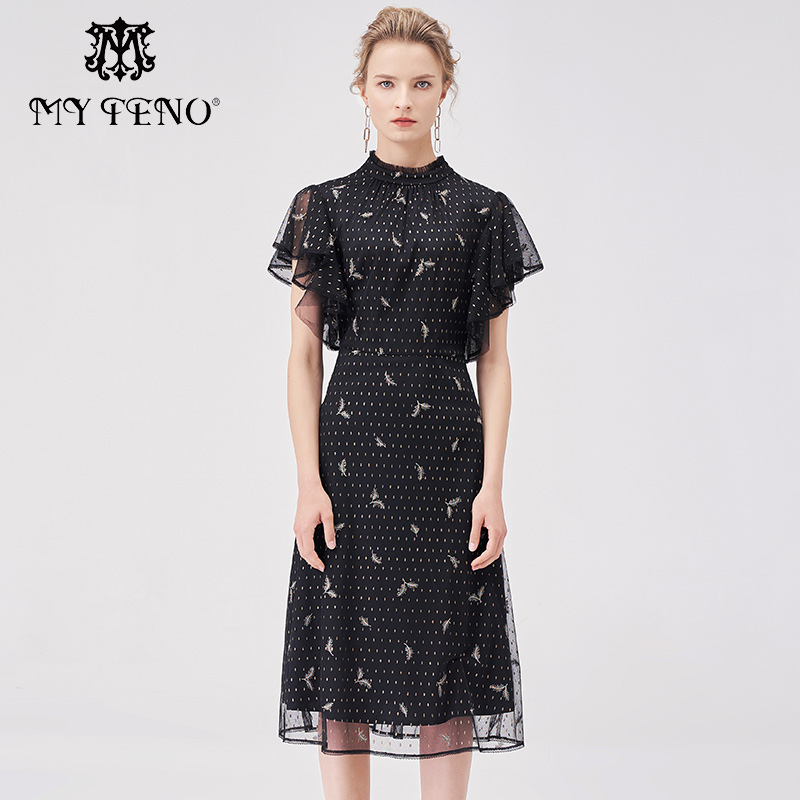 专柜正品马天奴春夏新品金色绣花黑色网纱连衣裙子立领喇叭袖礼裙