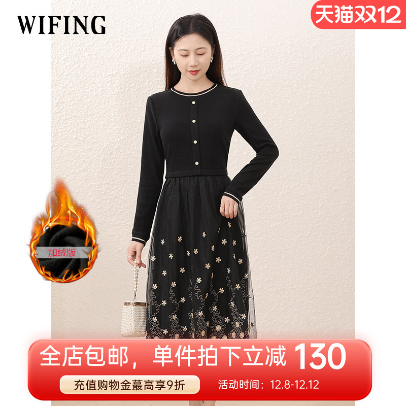 未风黑色网纱连衣裙秋冬2025新款加绒加厚女士打底内搭长袖裙子冬