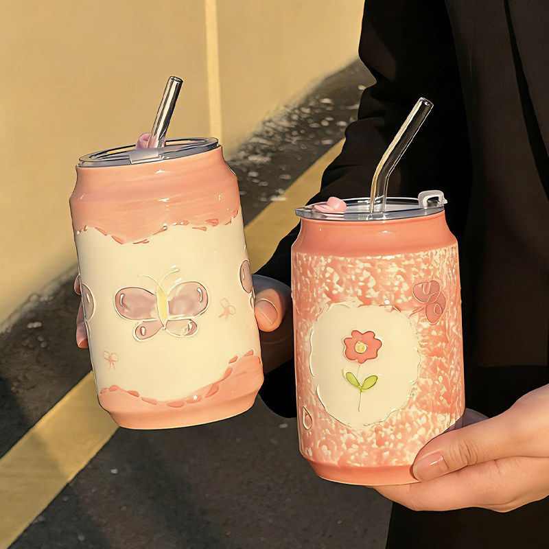 可爱郁金香陶瓷吸管杯子带盖特别好看的马克杯女生喝水杯生日礼物