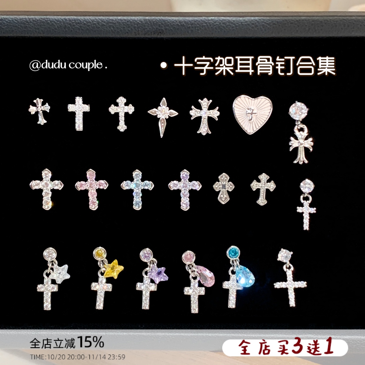 嘟嘟夫妇甜酷十字架耳钉医用钛钢养耳洞耳蜗耳饰睡觉免摘耳骨钉女