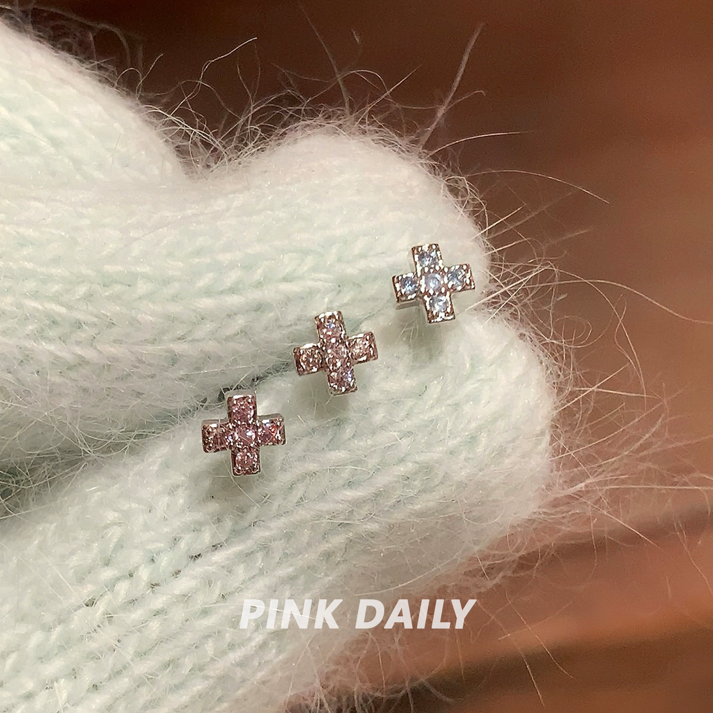 Pink Daily迷你满钻锆石十字架耳钉女精致小巧高级感耳骨钉耳饰