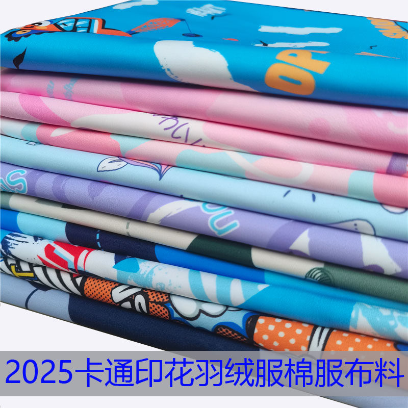 2025新款卡通布料印花羽绒服棉服布料童装布料防风罩衣服装布料