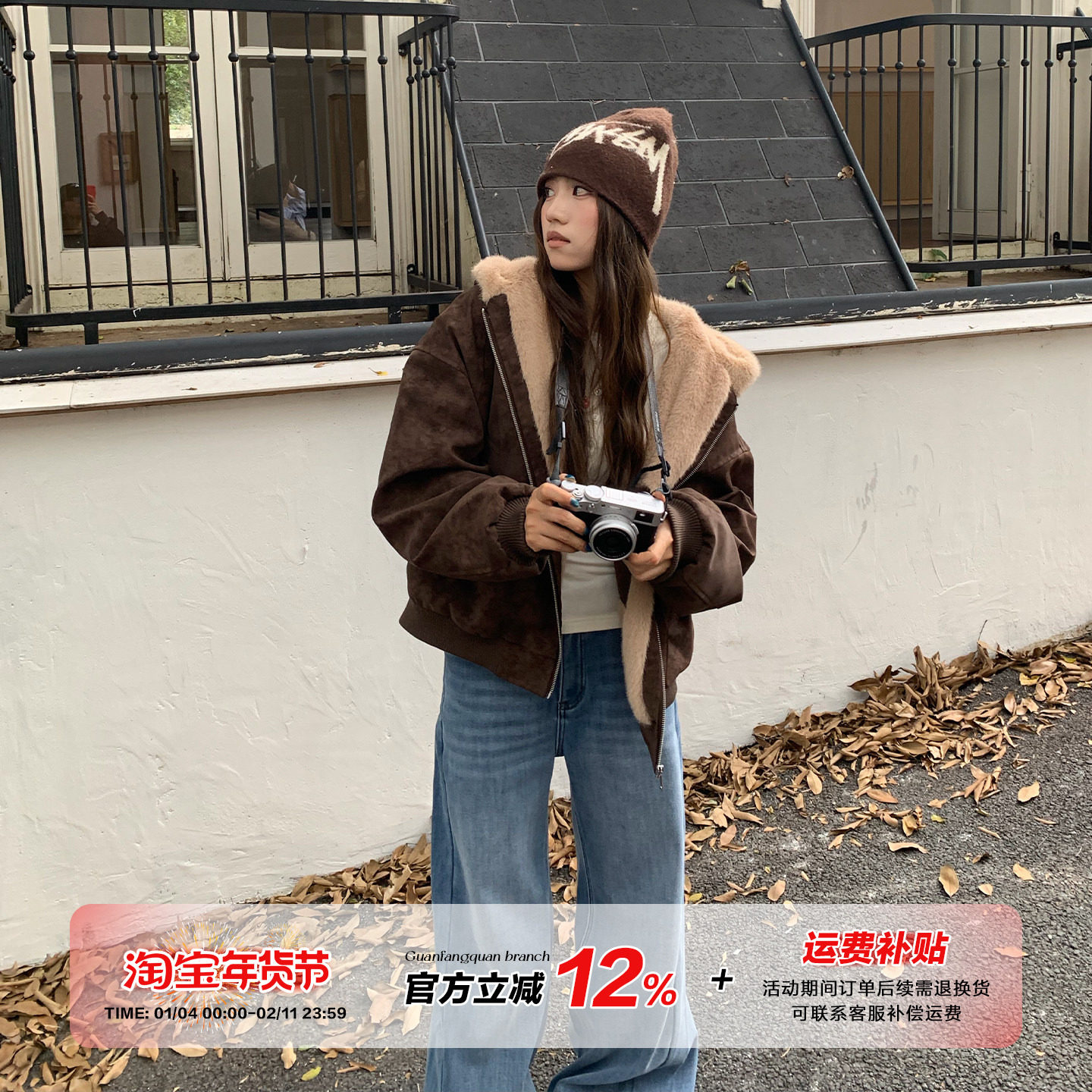 橘子树在哪儿美式麂皮连帽外套女冬防风保暖慵懒休闲宽松百搭棉服