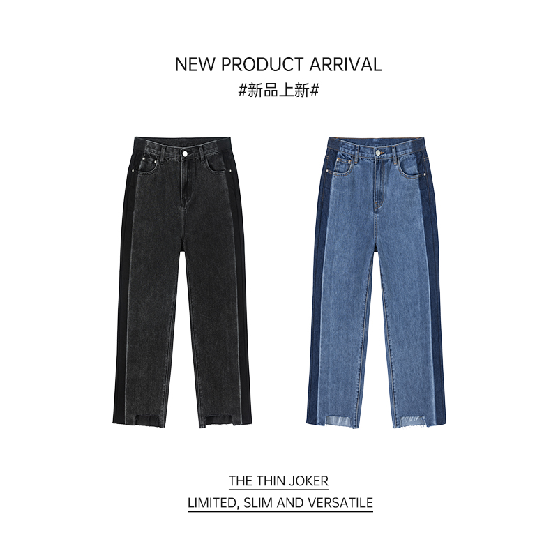 大码直筒拼接牛仔裤女秋冬新款胖妹妹mm韩版高腰显瘦阔腿九分裤子