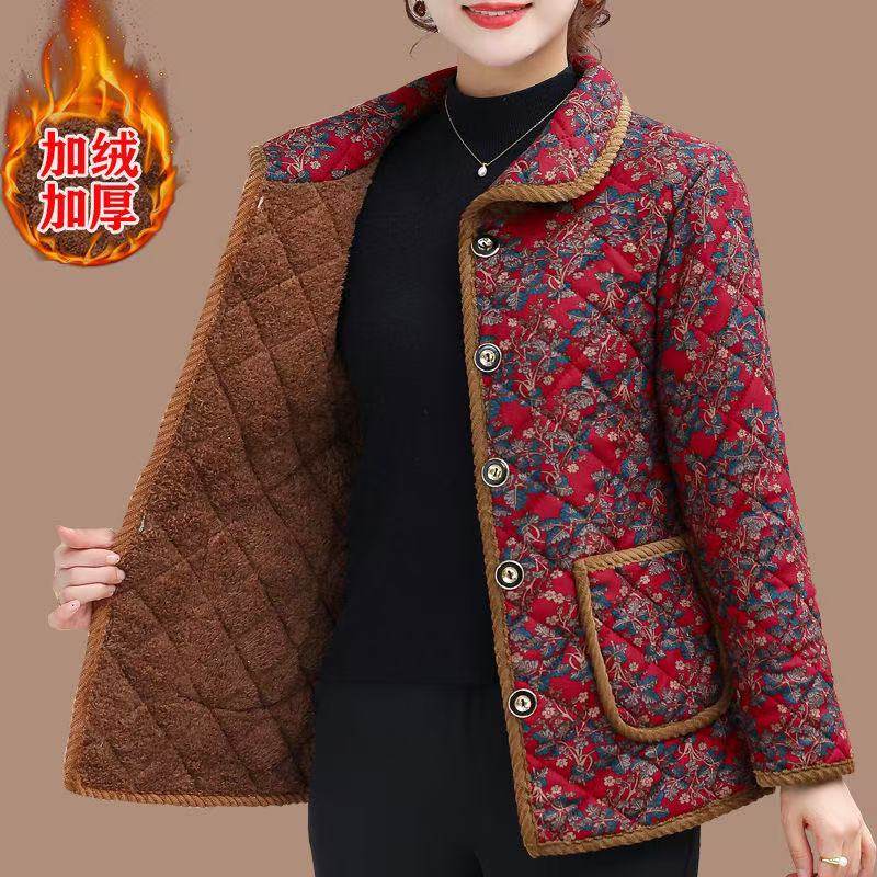 中年妈妈冬装印花棉衣外套加绒加厚复古盘扣民族风棉袄短款棉服女