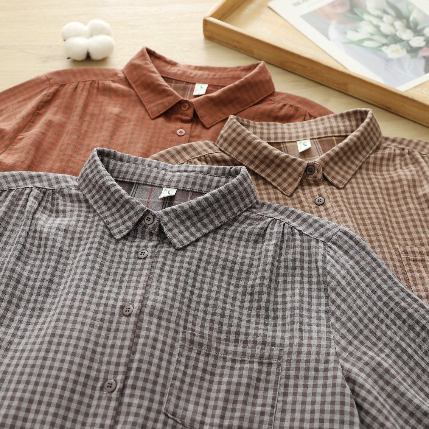 2025秋季文艺小清新复古格子双层棉纱宽松衬衫女长袖打底衫学生潮