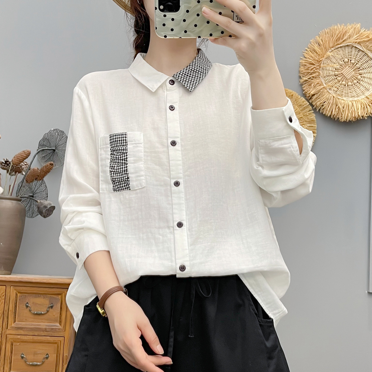 2025秋季文艺小清新格子包边元宝领纯棉衬衫女长袖打底衫学生叠穿