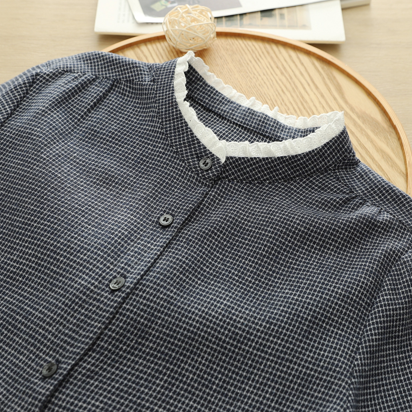 2025秋季文艺小清新立领蕾丝花边磨毛棉格子衬衫女长袖打底衫学生