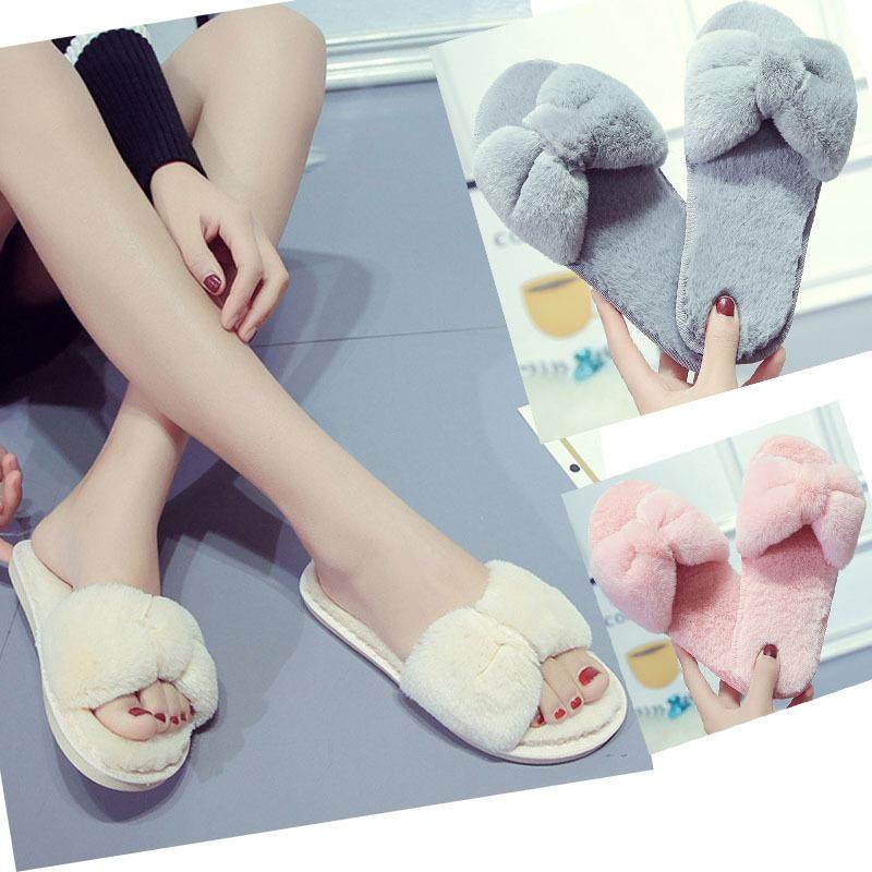 秋冬季新款仿兔毛棉拖鞋交叉带毛绒一字拖加绒毛毛拖鞋女居家室内